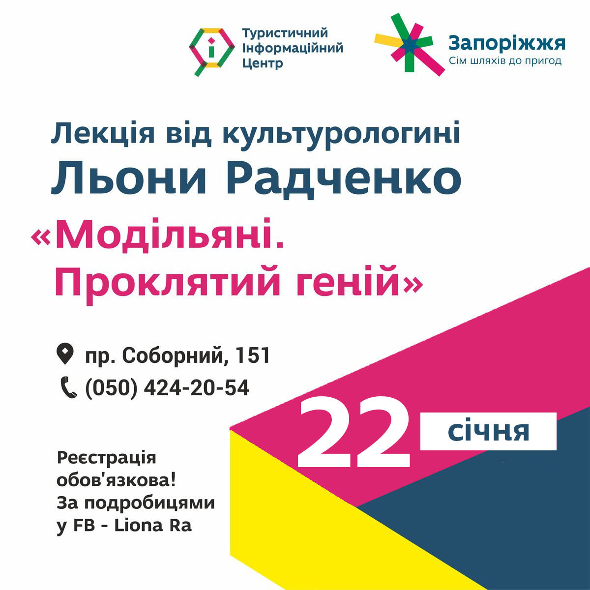 22 січня о 18:00 в Zaporizhzhia.city Hub лекція від Льони Радченко «Модільяні. Проклятий геній». На численні прохання аудиторії лекція про одного з найвідоміших художників кінця XIX - початку XX століття повертається