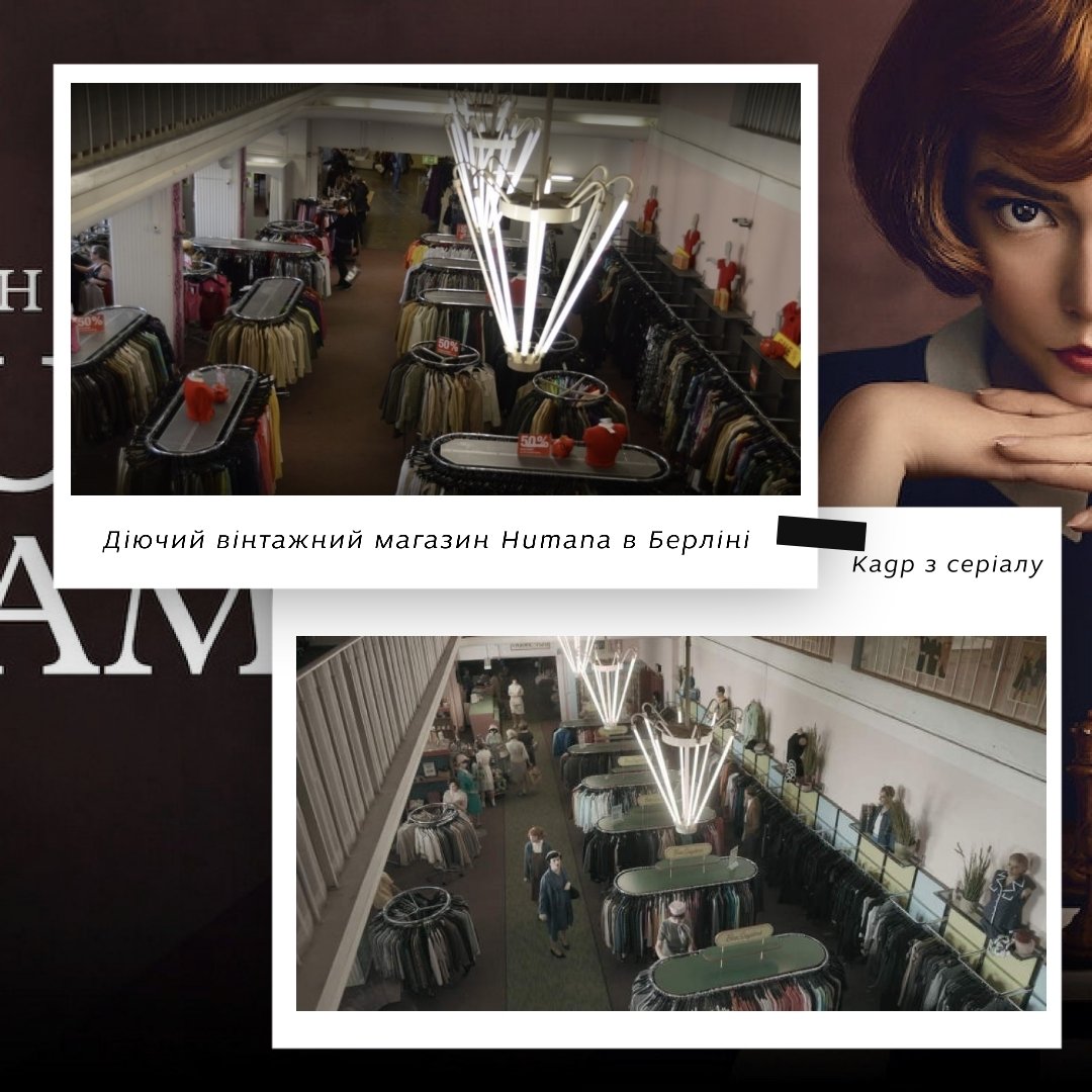 - Епізод, де Бет з прийомною мамою купують одяг, знімали у діючому вінтажному магазині Humana в Берліні.