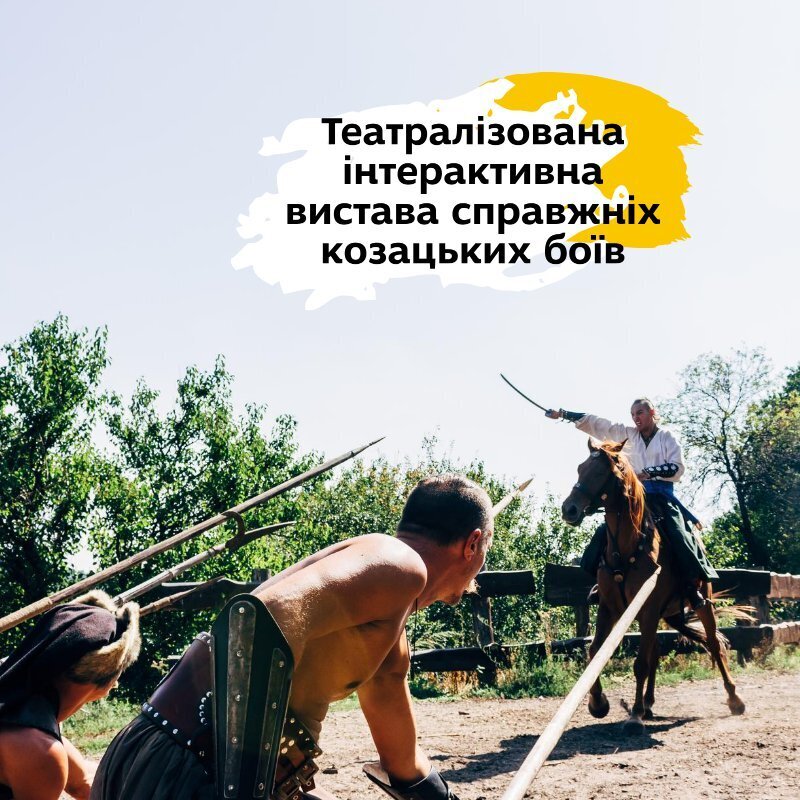 Ви зможете побачити театралізовану інтерактивну виставу справжніх піших та кінних козацьких боїв із залученням вогнепальної та холодної зброї. Дійство відбувається всього за декілька метрів від глядачів.
