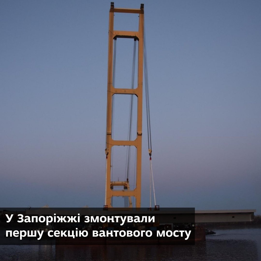 У Запоріжжі змонтували першу секцію вантового мосту. Конструкція завдовжки 84 метри та важить 720 тонн. Відкриття вантового мосту, який буде найвищим в Україні, заплановане на серпень 2021 року.