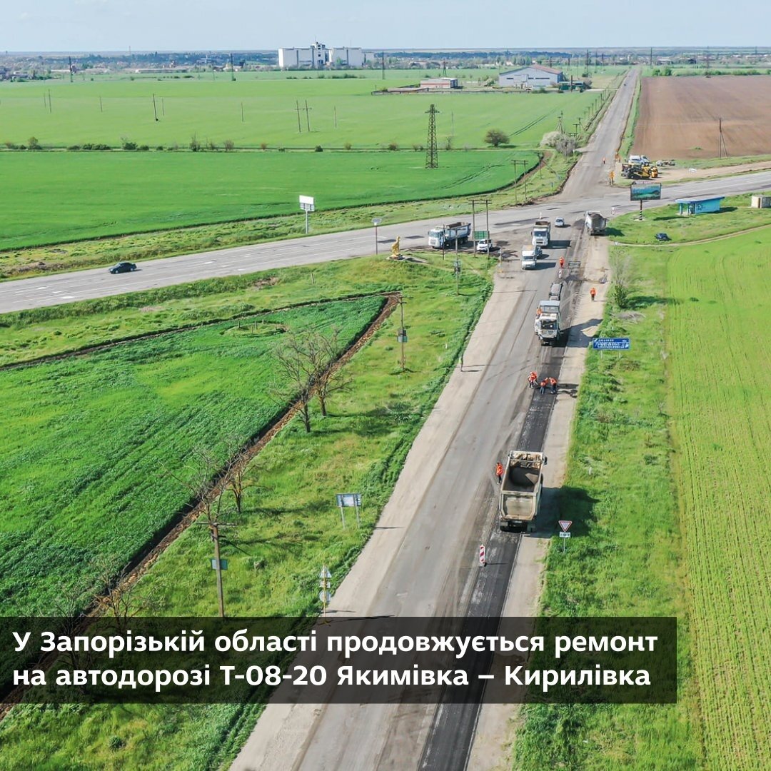 • В Запорожской области продолжается ремонт на автодороге Т-08-20 Акимовка - Кирилловка. Сейчас продолжаются работы по снятию старого дорожного покрытия и укладки нового асфальта. Отремонтировать более 40 км дороги должны до конца июня.