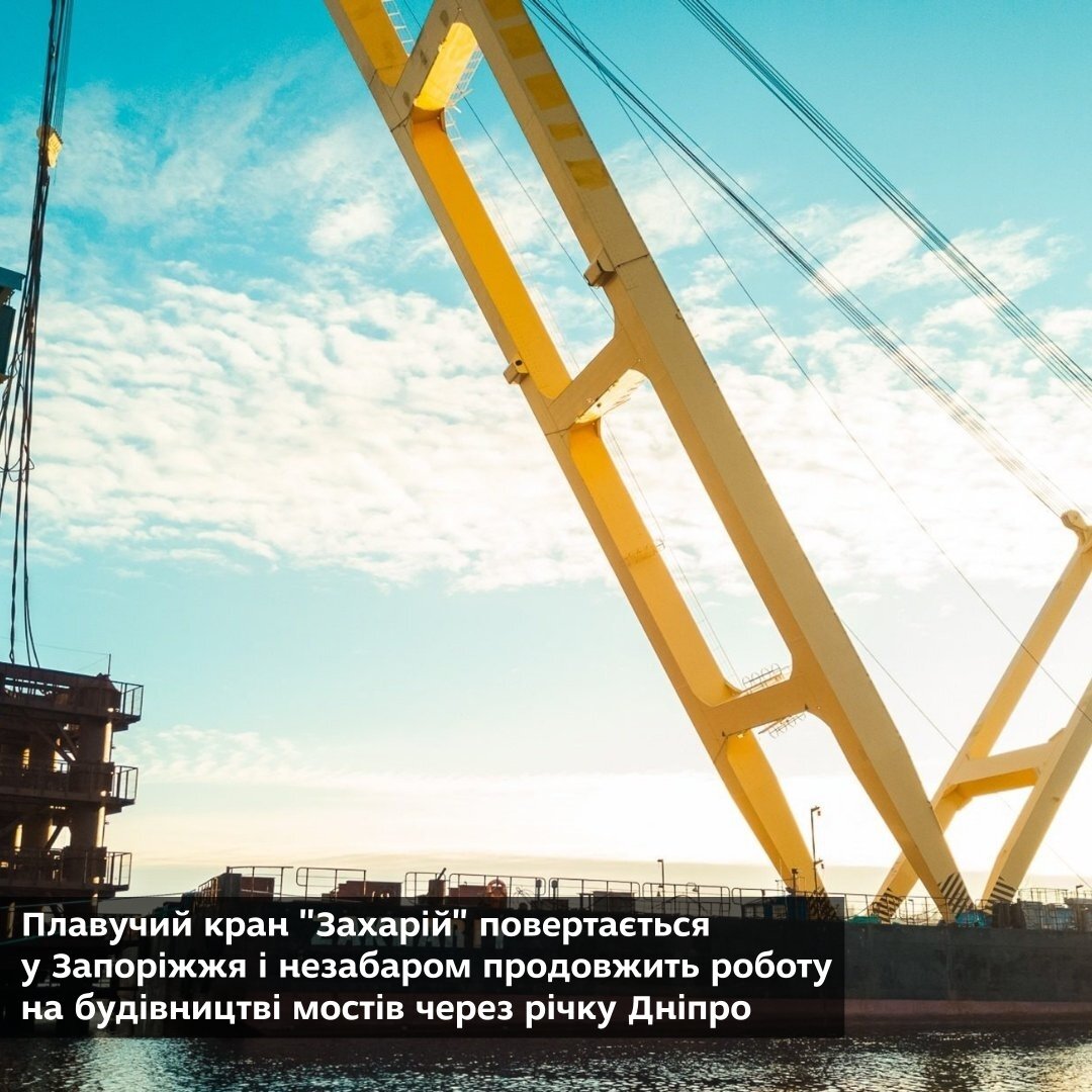 Плавучий кран "Захарій" повертається у Запоріжжя і незабаром продовжить роботу на будівництві мостів через річку Дніпро.