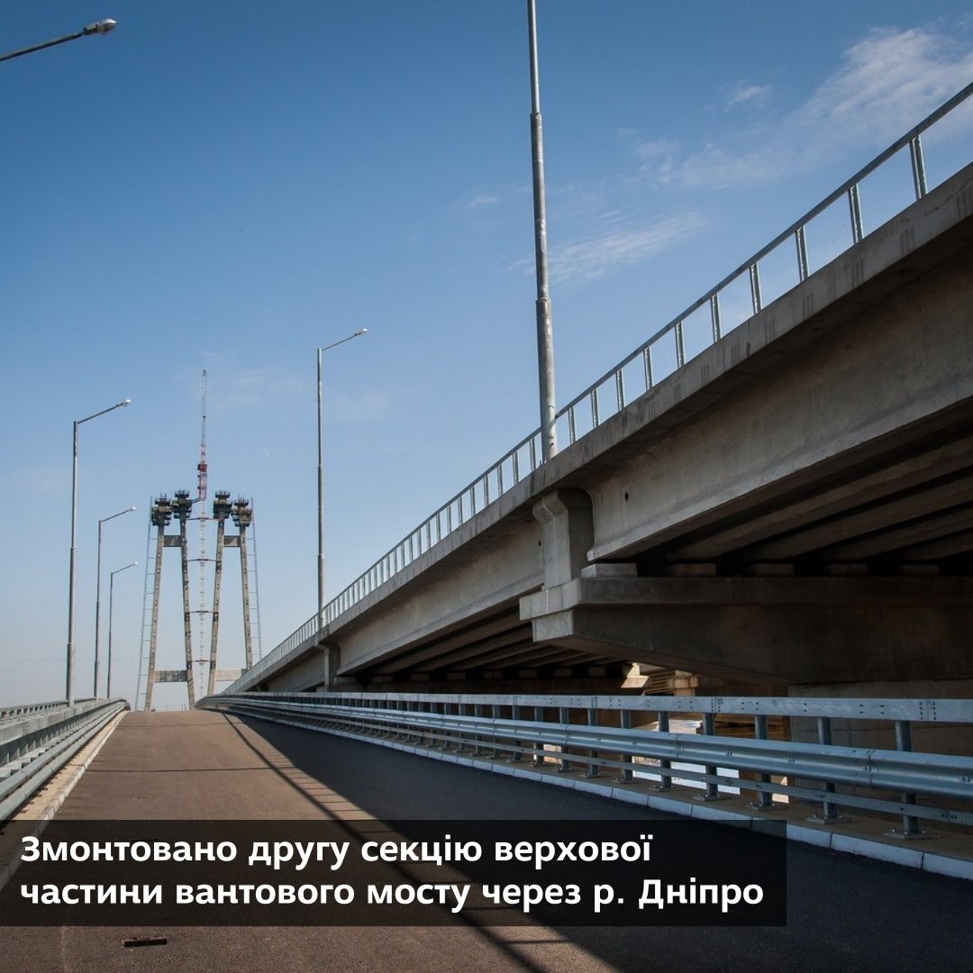 •   Змонтовано другу секцію верхової частини вантового мосту через р. Дніпро. Роботи зі встановлення прогонової будови вагою близько 700 тонн тривали 13 годин.  Поточний етап робіт триватиме безперервно протягом 40-45 днів. За цей час будуть встановлені і змонтовані 6 секцій мосту.