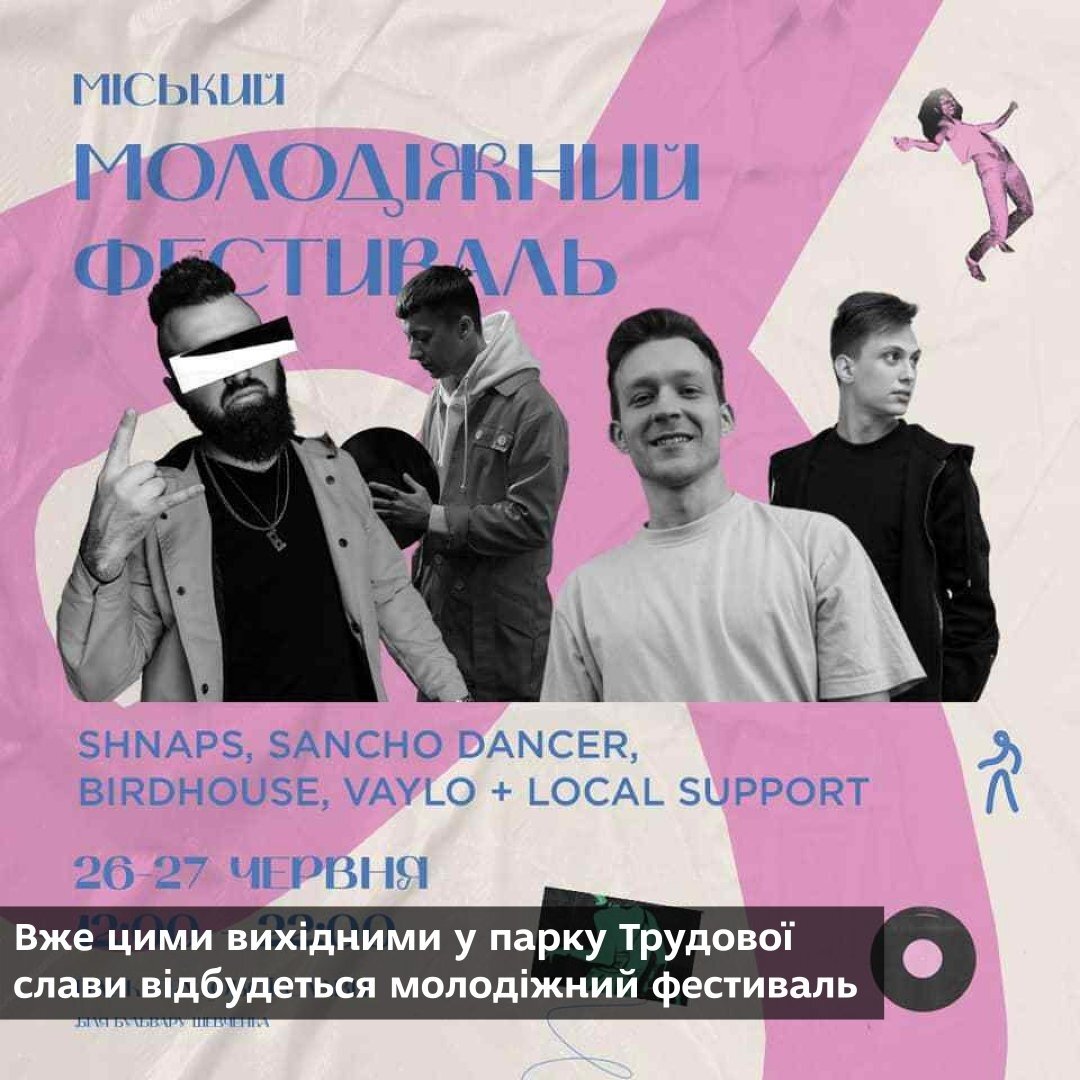 •   Вже цими вихідними у парку Трудової слави відбудеться молодіжний фестиваль. На гостей чекають виступи діджеїв та музичних гуртів, стендап концерт. На одній з локацій буде організовано ярмарок громадських організацій. Працюватимуть лекторій, зона аніме, дитячі зони, творча майстерня, зона віртуальної реальності та робототехніки. Початок святкувань о 12:00.