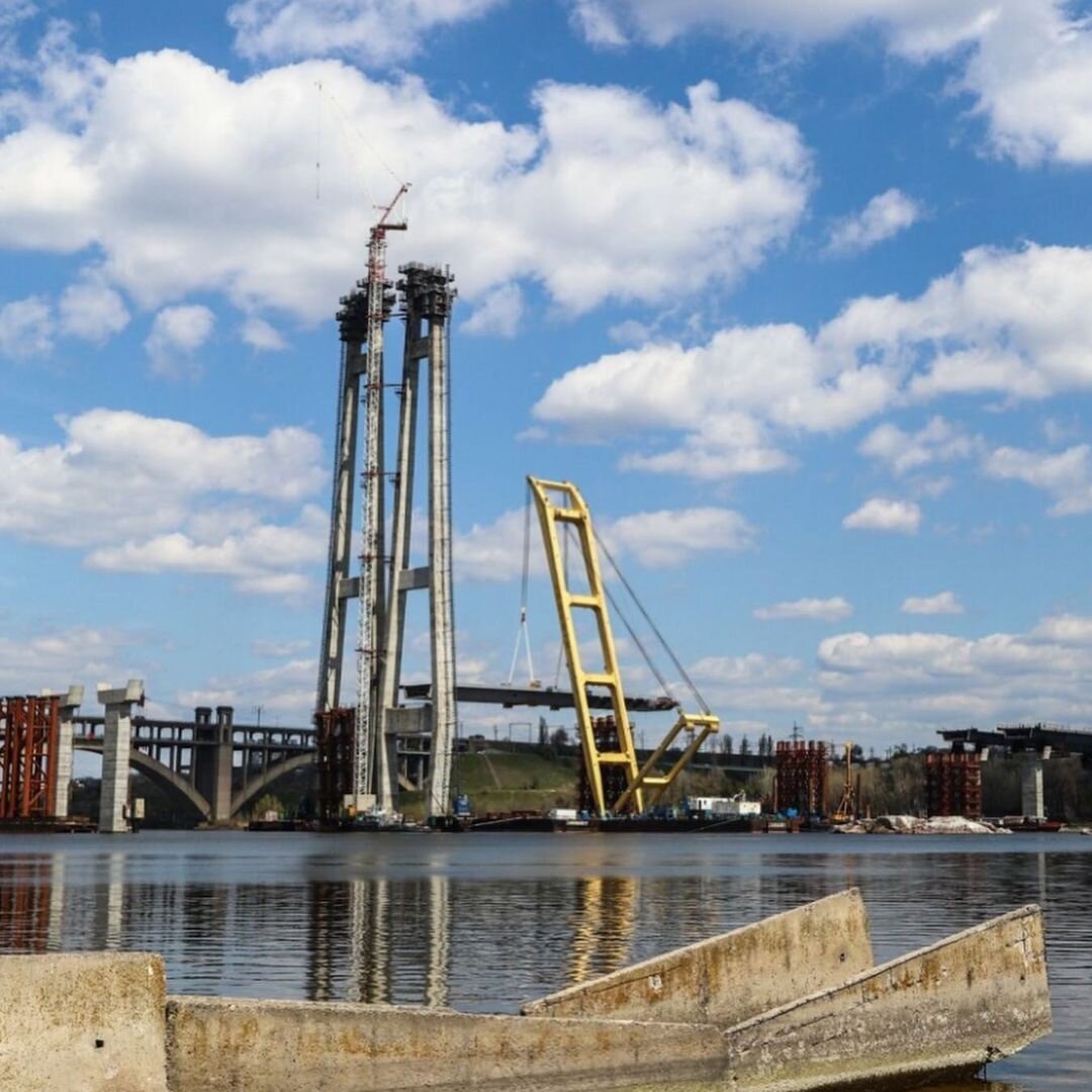 • Завершено монтаж третьої секції верхової частини вантового мосту через Дніпро. Ця секція вагою в 685 тонн з'єднала пілон із підходами до мосту з боку Прибережної магістралі. Наступний етап - підготовка до монтажу прольоту від пілона в бік острову Хортиця.