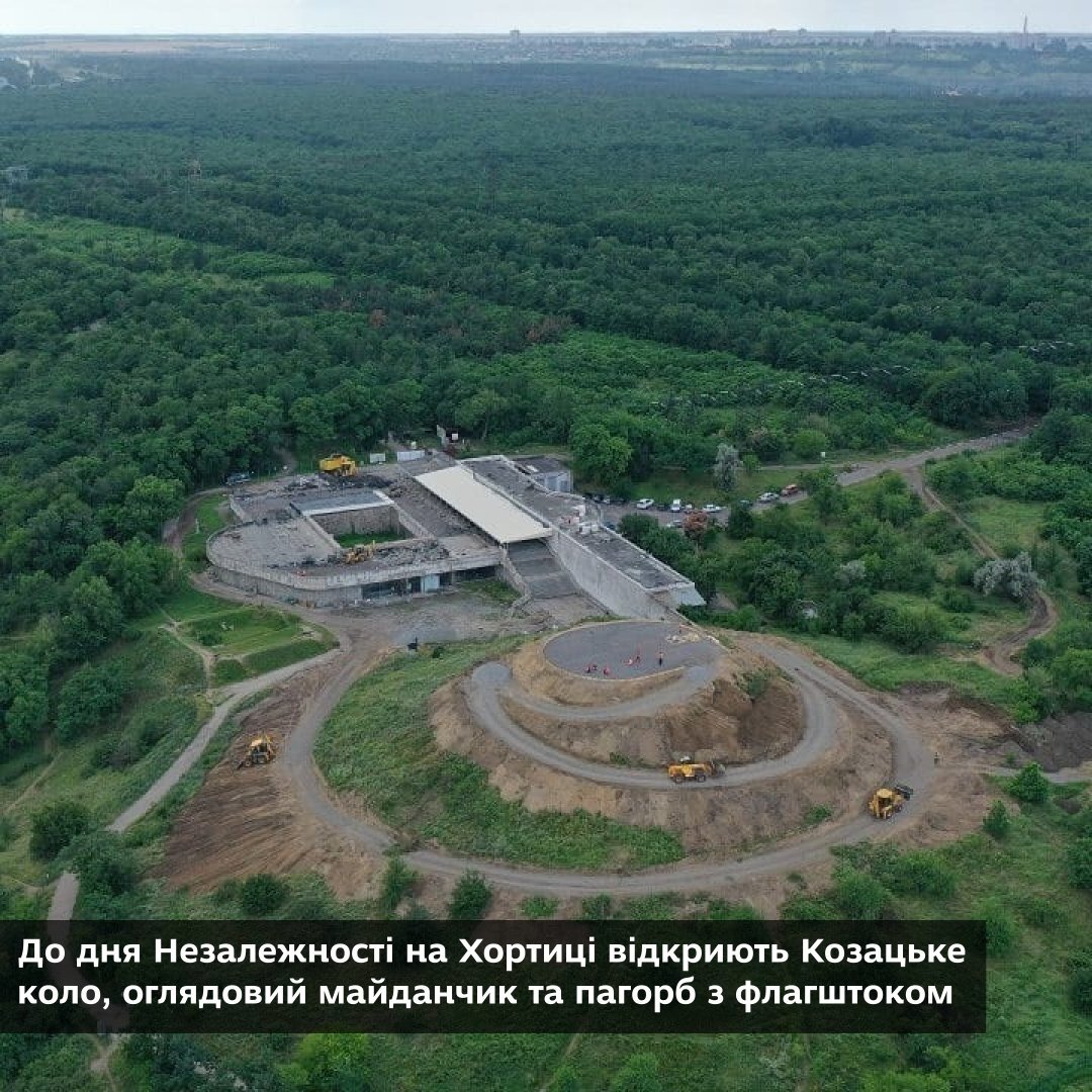 • До дня Незалежності на Хортиці відкриють Козацьке коло, оглядовий майданчик та пагорб з флагштоком. На території острова працюватиме Музей історії козацтва, будуть облаштовані зони відпочинку, проєктування здійснено згідно з нормами інклюзивності.