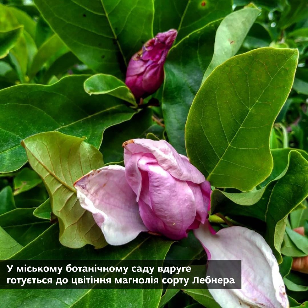 У міському ботанічному саду вдруге готується до цвітіння магнолія сорту Лебнера. Зазвичай цей сорт випускає квіти у квітні-травні. Цього разу чагарник квітує вже другий раз на рік.