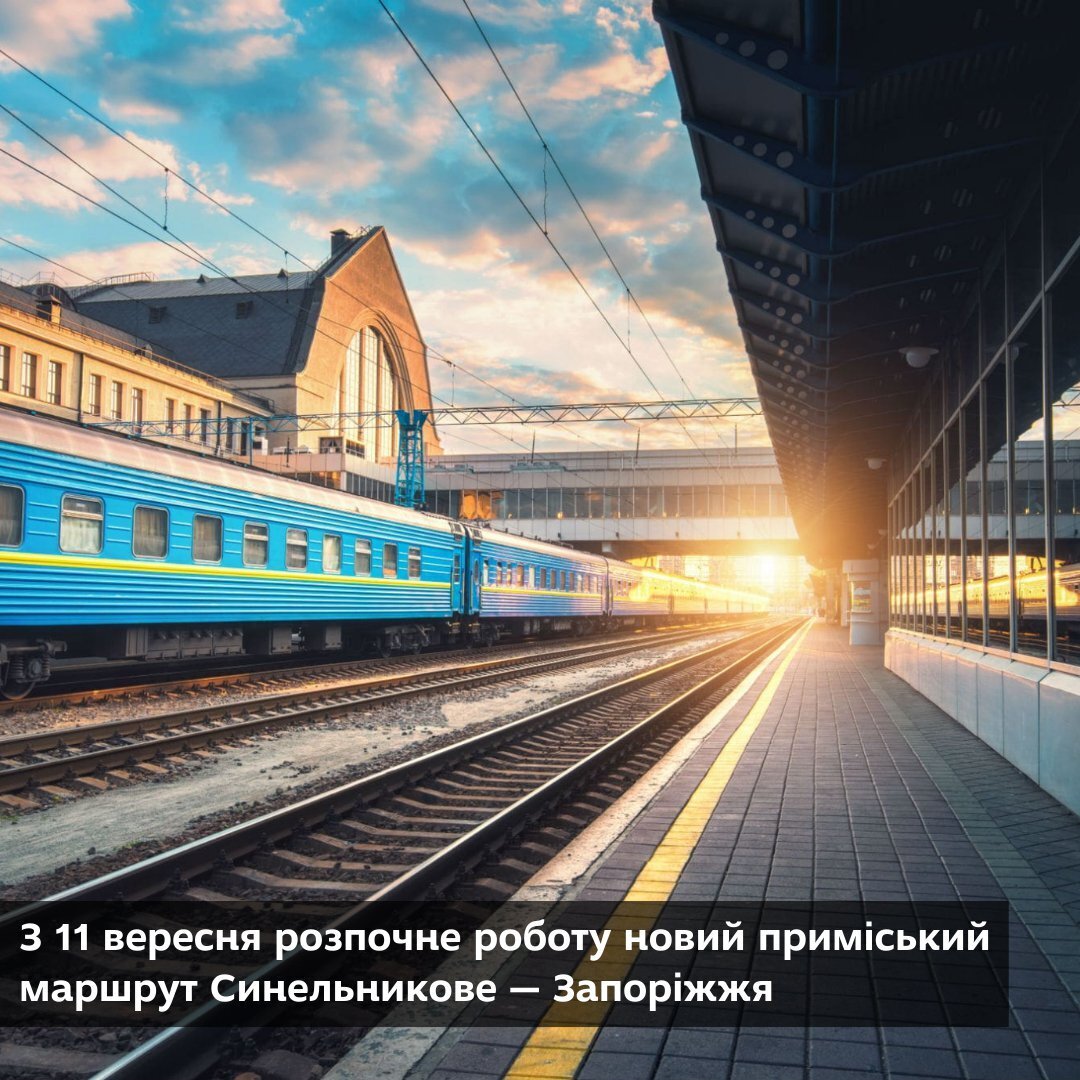 З 11 вересня розпочне роботу новий приміський маршрут. Електричка №6545/46 Синельникове — Запоріжжя відправлятиметься зі станції Синельникове-1 о 08:30, із прибуттям на кінцеву зупинку Запоріжжя-2 о 10:35
