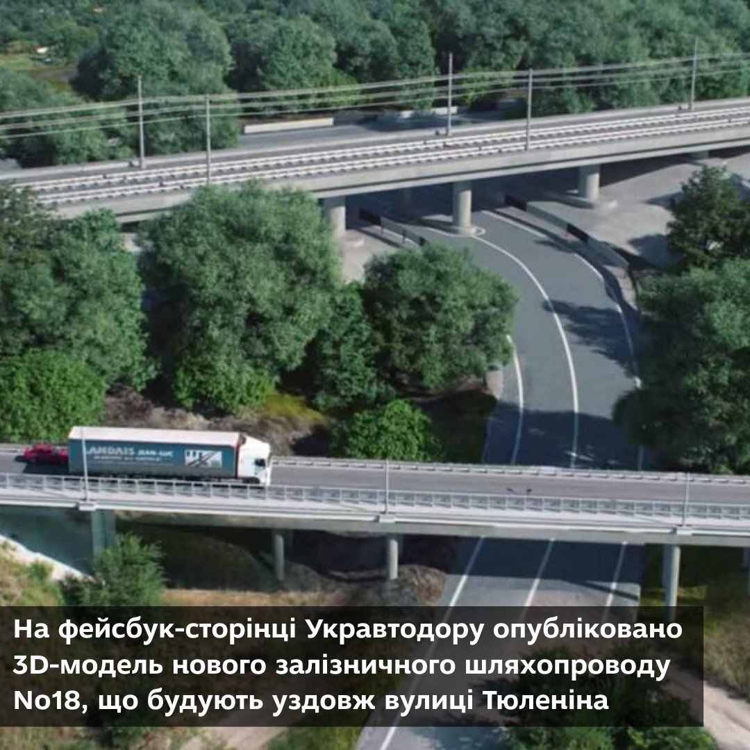 На фейсбук-сторінці Укравтодору опубліковано 3D-модель нового залізничного шляхопроводу №18, що будують уздовж вулиці Тюленіна. Під цим об'єктом проходитиме автотранспортна магістраль (заїзд на вантовий міст). Будівельні роботи тривають.