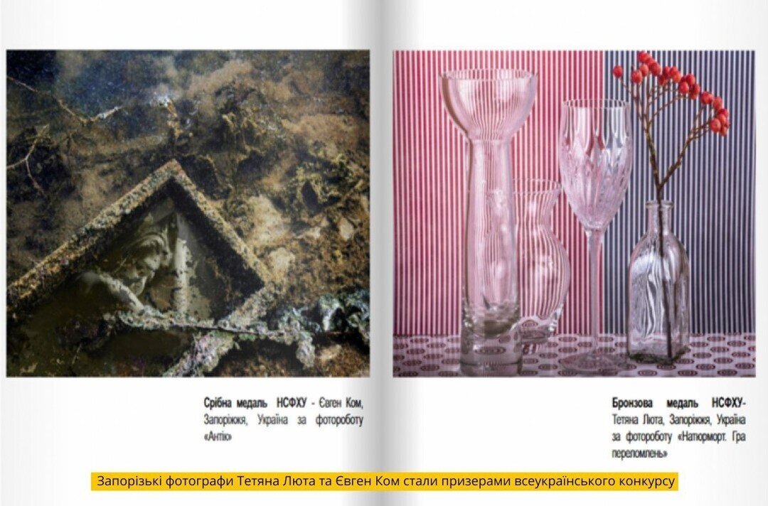 • Запорізькі фотографи Тетяна Люта та Євген Ком стали призерами всеукраїнського конкурсу! Євген Ком отримав срібну медаль від Національної спілки фотохудожників України за роботу «Антік». Роботу Тетяни Лютої «Натюрморт. Гра переломлень» було відзначено бронзовою медаллю.