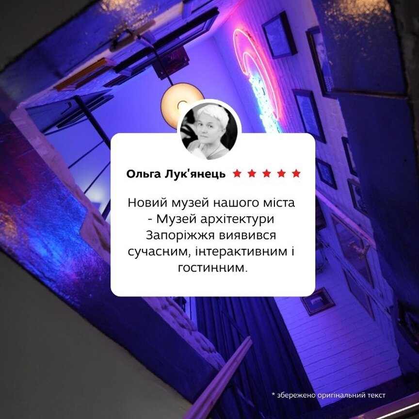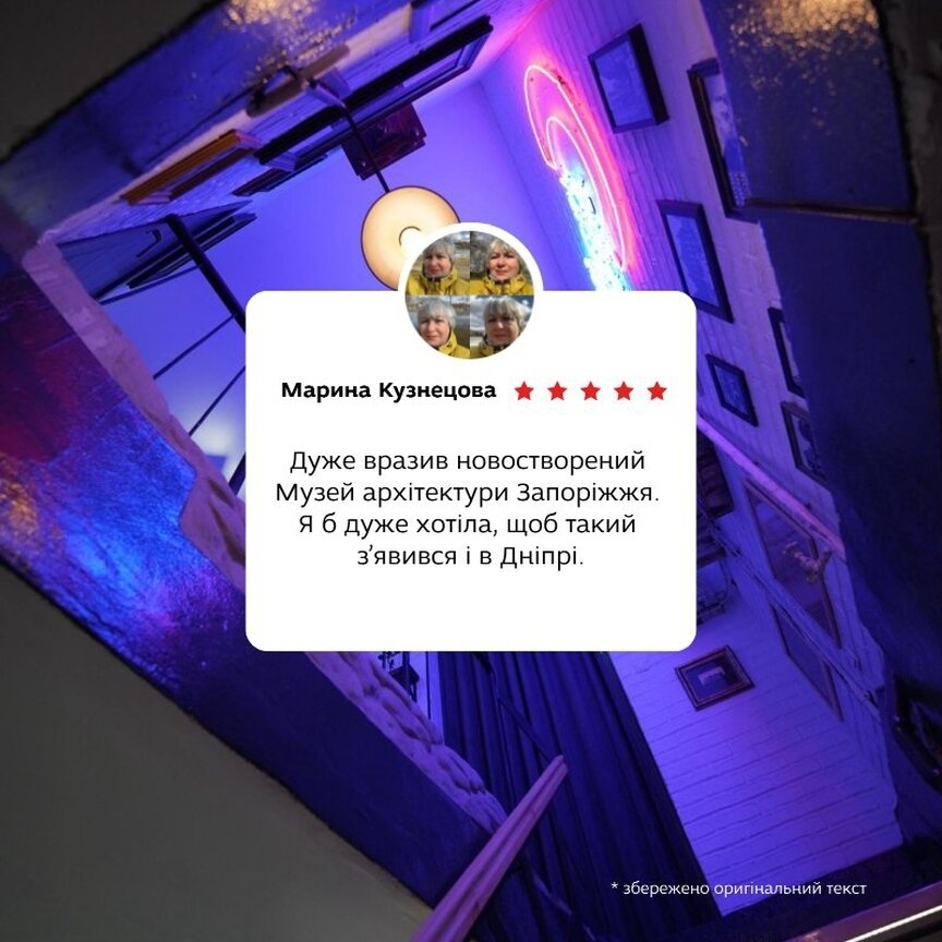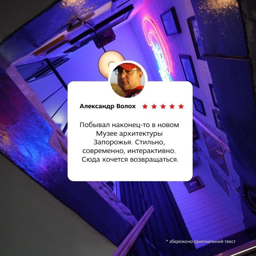 • Аліна Федорова: "А ви вже відвідали Музей архітектури Запоріжжя? Тоді раджу виділити 30 хвилин вашого часу на похід в сучасний музей. Це не той радянський музей, це сучасний формат, коли окрім фото та експонатів, є відеоряд та інформаційні блоки. В залах чути звуки вулиць тих часів, в першій кімнаті я хвилин 10 стояла слухала через навушник звуки залізничної станції, а потім ще раз повернулася.. В залі менонітів зачаровує колискова "Жуже-петруже" . Ну це однозначно лайк Круто, що в Запоріжжі з'являються такі музеї."