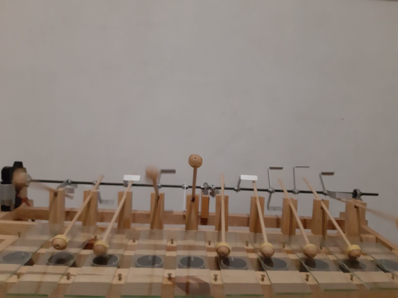 Інструмент, який демонструє – музика оточує нас навколо, і перші музичні композиції починалися з простих звуків і речей та були доступні кожному. Зібрана із елементів, які, здавалося б, не мають відношення до музики, механічна марімба грає мелодії від ностальгічних до грайливих.