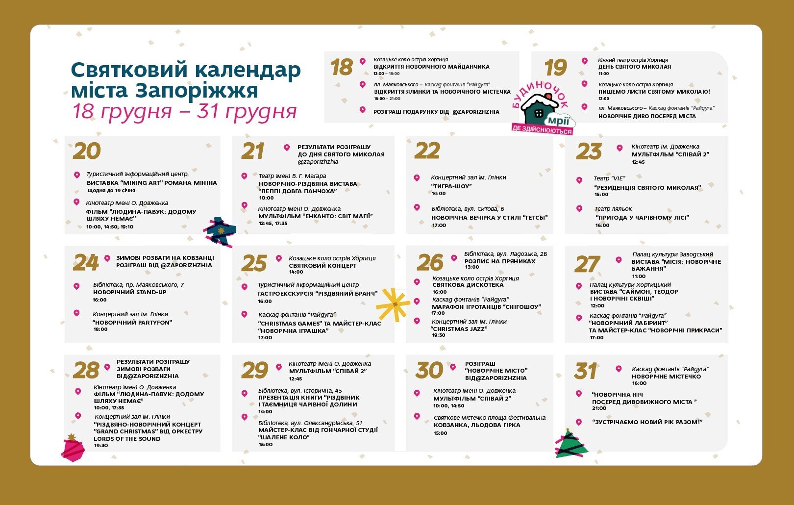 Також у рамках святкування в місті будуть проходити різноманітні новорічні заходи та активності. Щоб не пропустити все найцікавіше – зберігайте зручний календар та плануйте свій відпочинок заздалегідь.