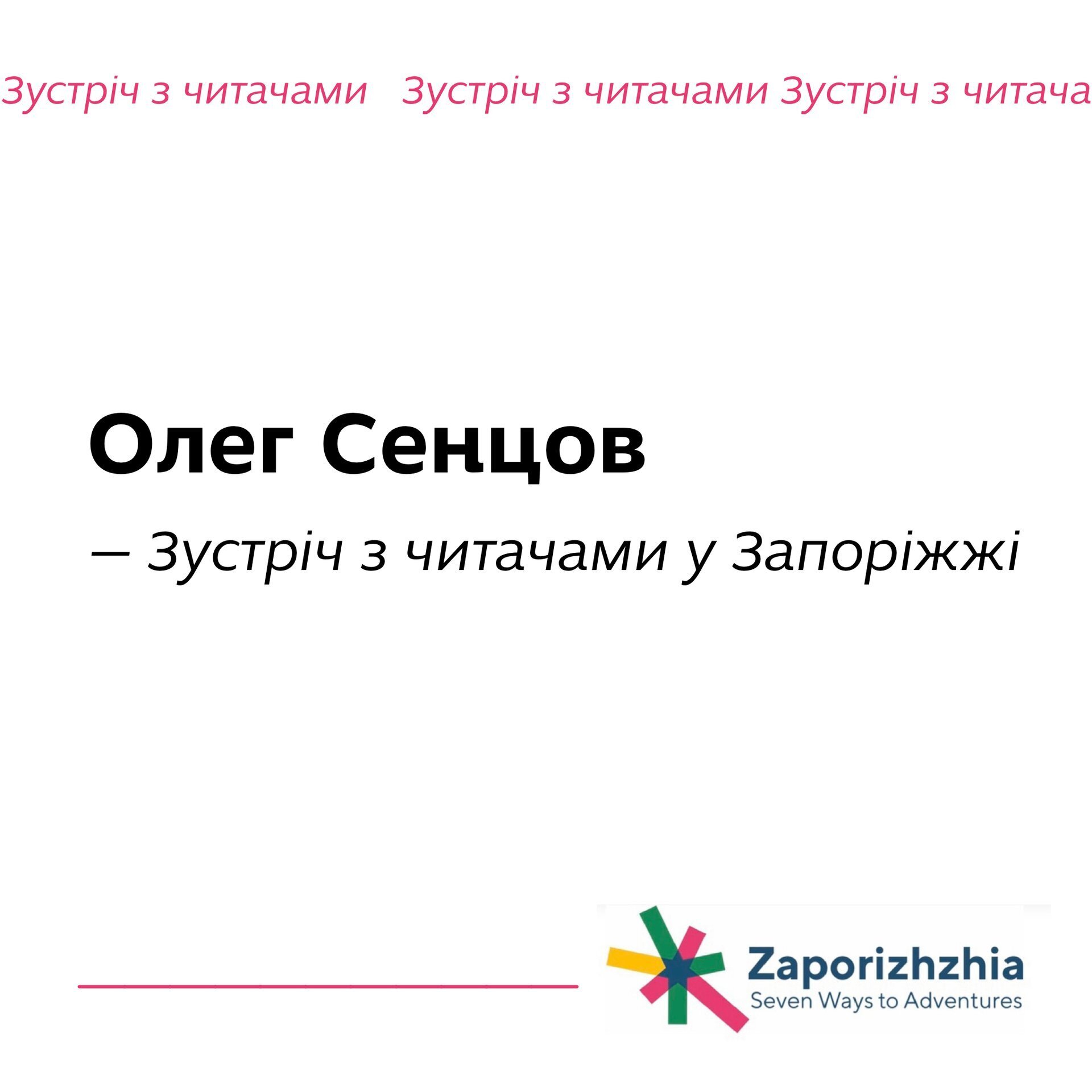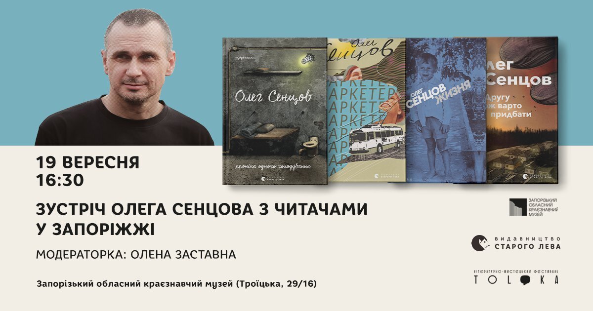 19 вересня у Запоріжжі відбудеться зустріч із режисером, сценаристом, письменником та громадським активістом Олегом Сенцовим. Під час зустрічі автор розповість про свої книги "Хроніка одного голодування", "4 з половиною кроки", "Другу також варто придбати", "Маркетер" і "Жизня".