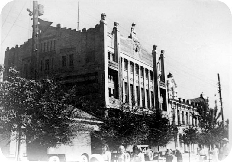 Будинок за проєктом відомого українського архітектора Віктора Естровича зведено у 1912 році. Будівлю в стилі модерн увінчували 5 скульптур на чолі з Гермесом – богом торгівлі та збагачення. Будинок був не лише красивим, але й продуманим технічно. Мав залізний дах, протипожежні стіни та вогнетривкі сходи.⠀