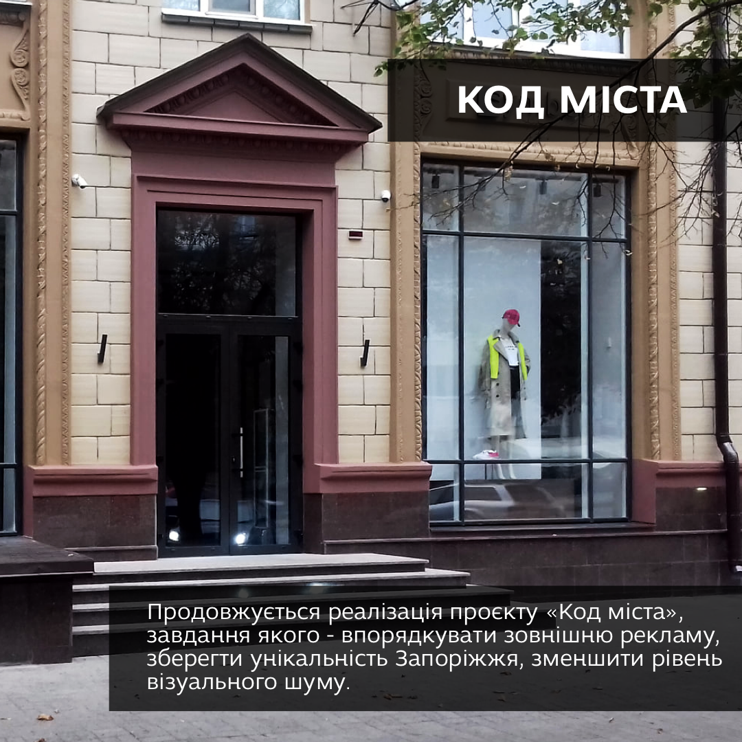 Продовжується реалізація програми "Код міста". Метою розробки концепції є впорядкування зовнішнього вигляду вулиць, збереження архітектурних та історичних пам’яток; створення умов для розвитку туризму в Запоріжжі. Позитивні результати програми вже вдалося продемонструвати наочно.