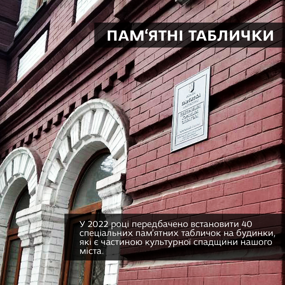 Крім того, у 2022 році передбачено встановити 40-ка спеціальних пам’ятних табличок на будинки, які є частиною культурної спадщини нашого міста.