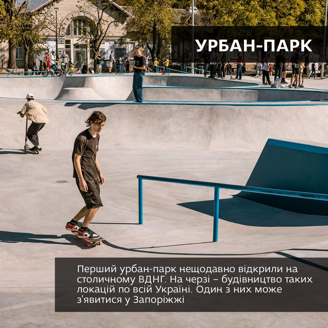 У місті планують збудувати сучасний урбан-парк. Перший урбан-парк нещодавно відкрили на столичному ВДНГ. На черзі – будівництво таких локацій по всій Україні. Один з них може незабаром з'явитися у Запоріжжі.