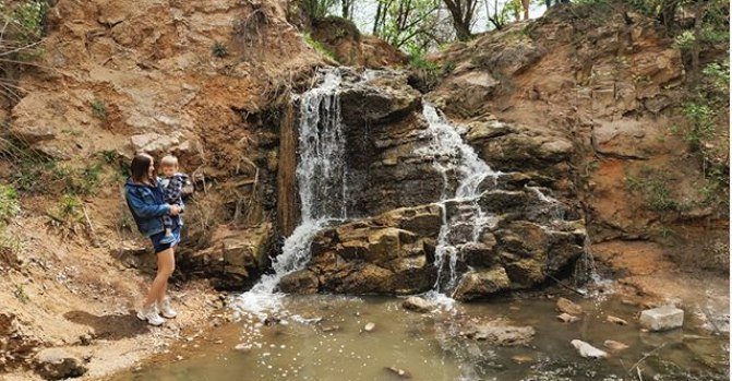 Висота штучного водоспаду становить 4,5 метра. Виник він у результаті спорудження дамби. Матеріалом для її будівництва послужив натуральний камінь, тому його дуже складно відрізнити від природного водоспаду.