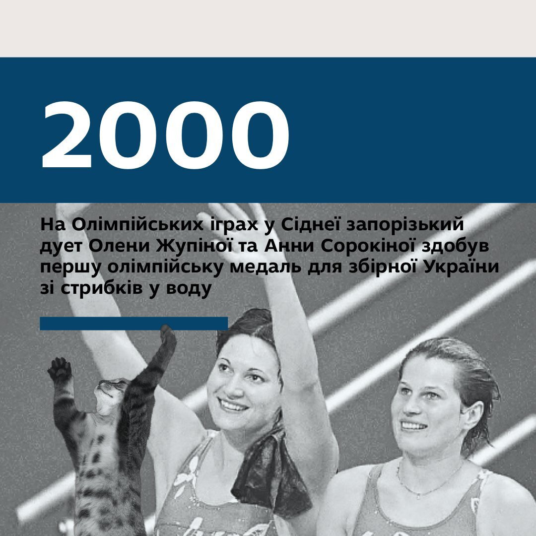 ▪️ 2000 рік – на Олімпійських іграх у Сіднеї запорізький дует Олени Жупіної та Анни Сорокіної здобув першу олімпійську медаль для збірної України зі стрибків у воду