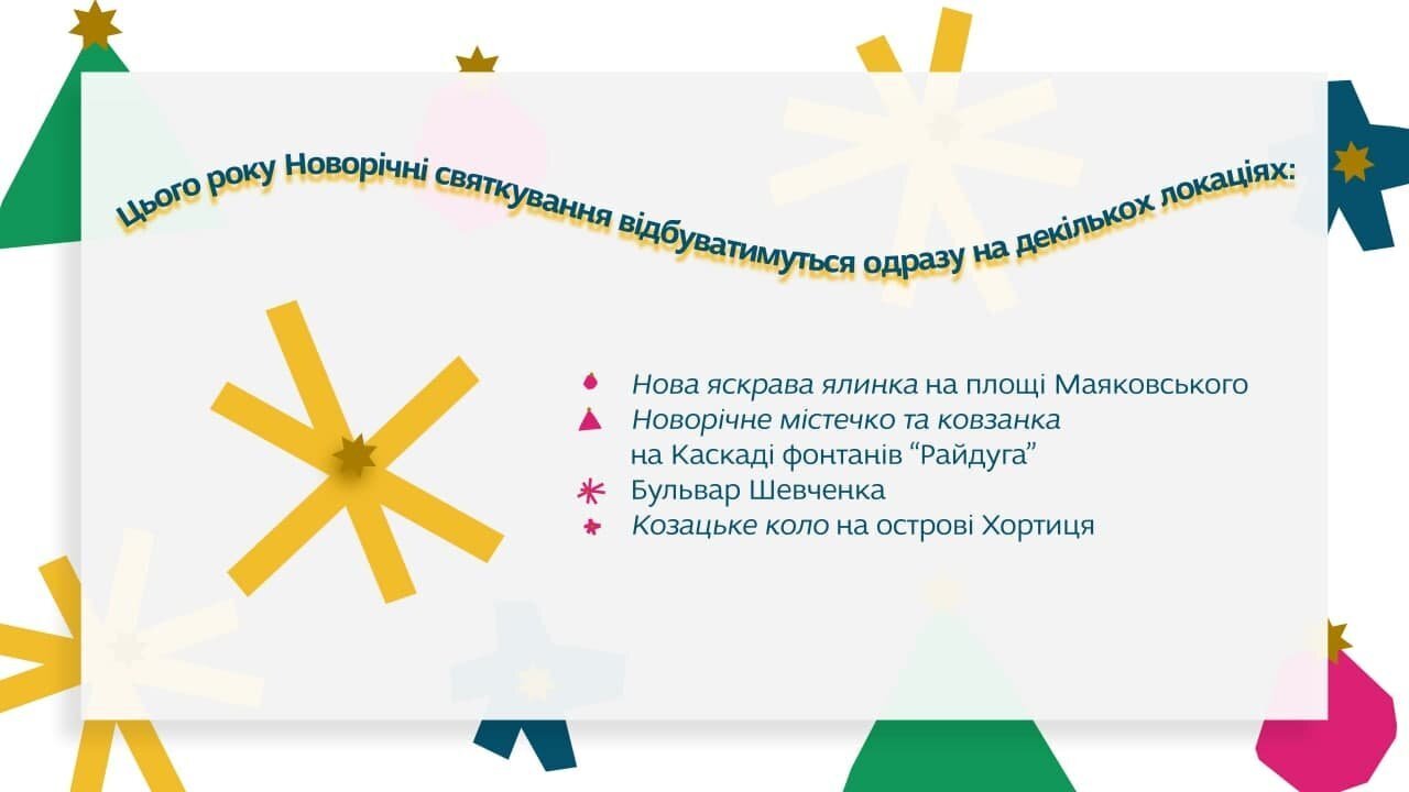 Цього року Новорічні святкування відбуватимуться одразу на декількох локаціях, а кожного вікенду на містян та гостей Запоріжжя чекають цікаві активності.