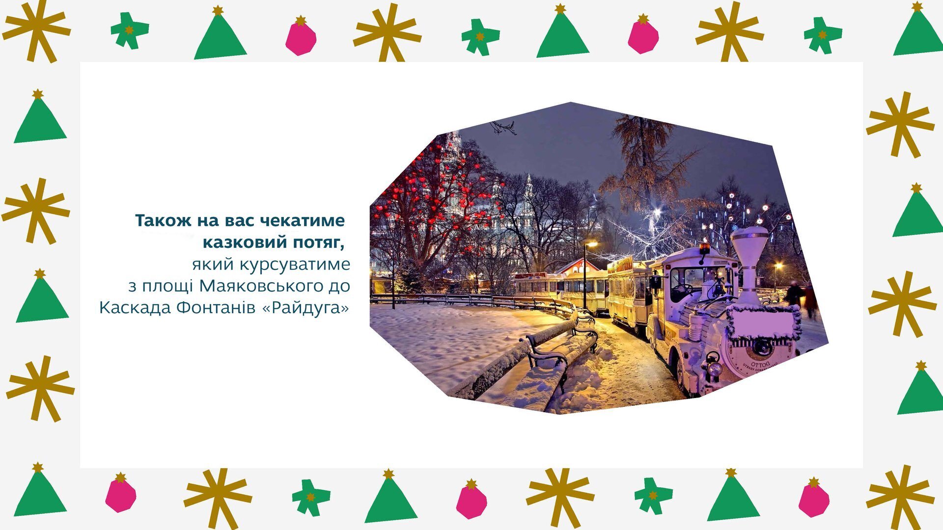 Новорічні містечка з’являться на площі та проспекті Маяковського, Козацькому колі, Каскаді фонтанів “Райдуга”.