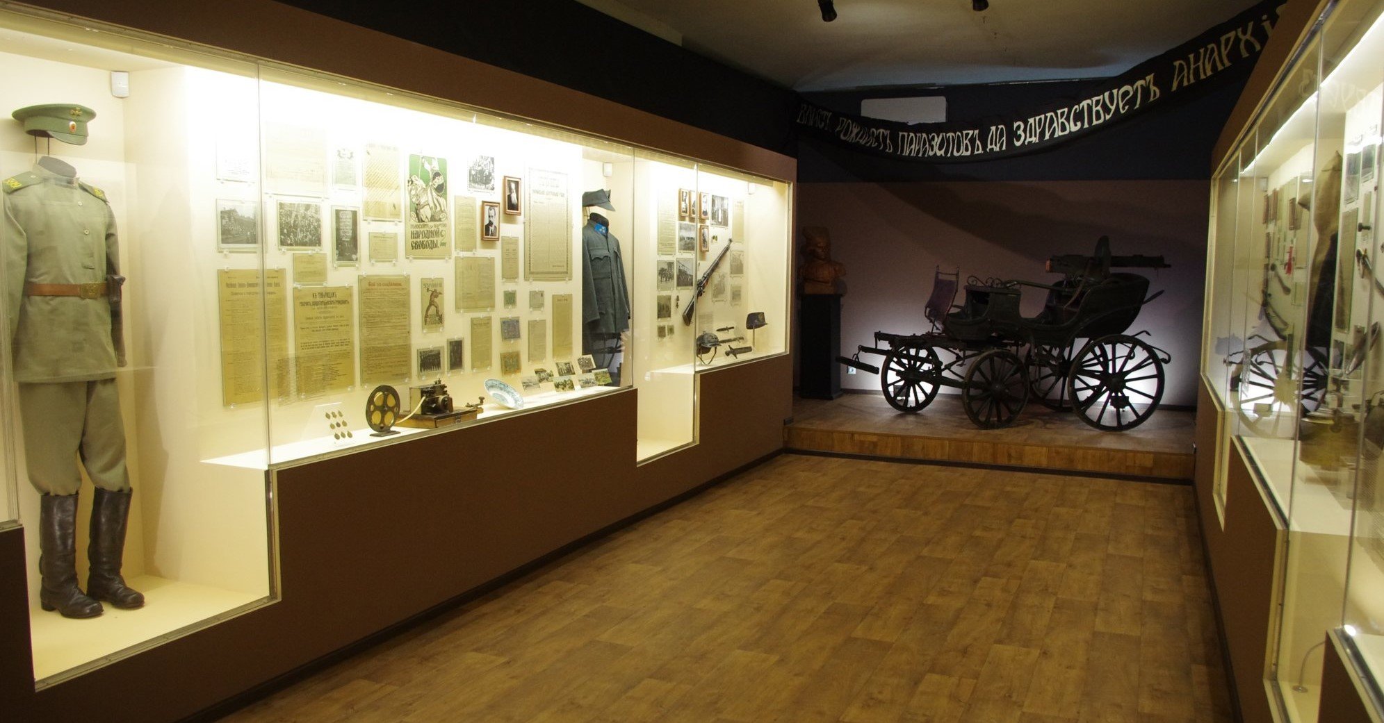 • махновську тачанку, зброю, одяг, місцеві газети, фотографії, копії документів;