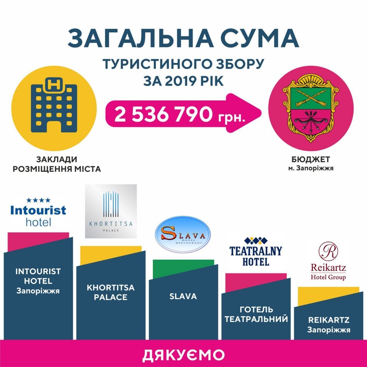 Туристичний збір у Запоріжжі вже більше ніж 2,5 мільйона гривень. Загальна сума туристичного збору за минулий рік - 2 536 790 грн