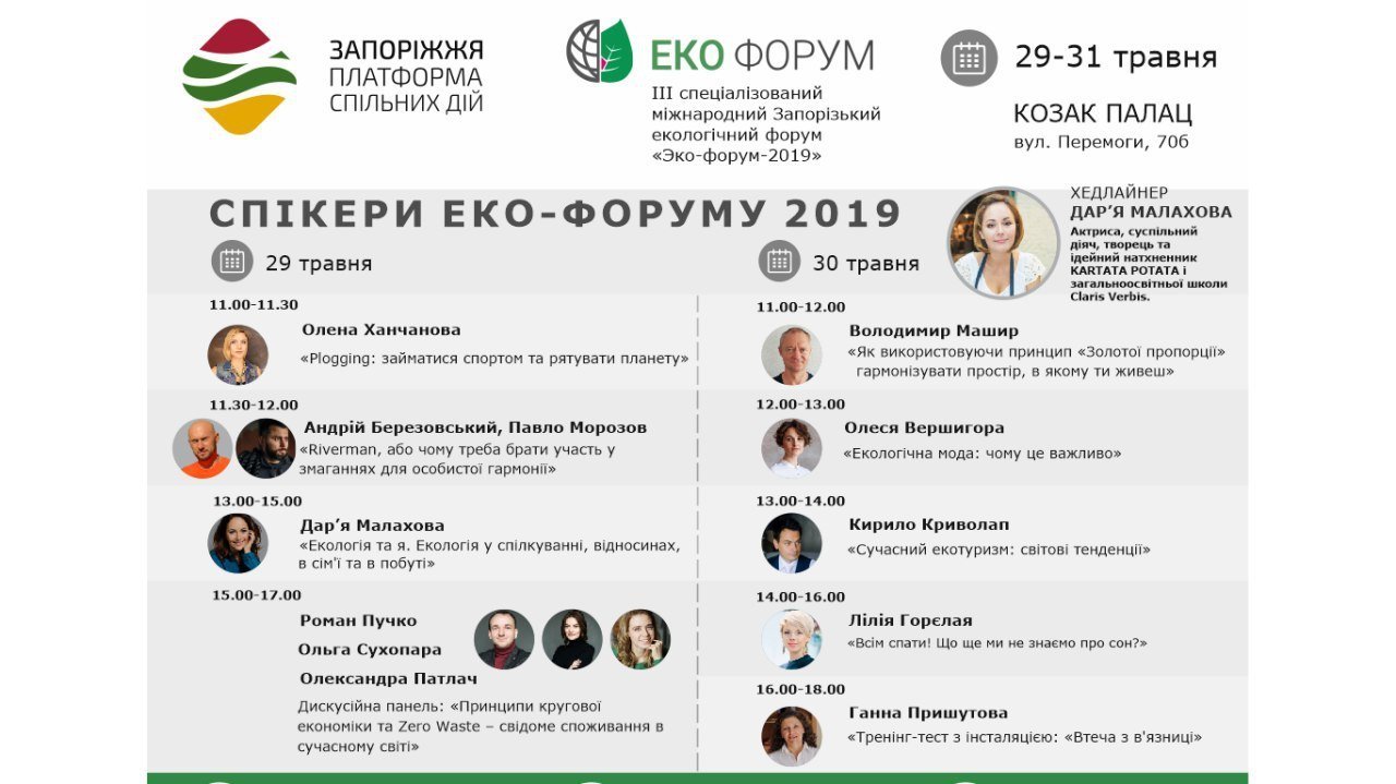Партнером “Еко-форуму” виступає громадська організація “Запоріжжя. Платформа спільних дій”. На головній сцені “Козак-палац” з 11-00 та до 18-00 години говоритимуть про персональну екологічну відповідальність, головні сучасні еко-тренди, еко-туризм, здорове ставлення до себе та оточуючих.