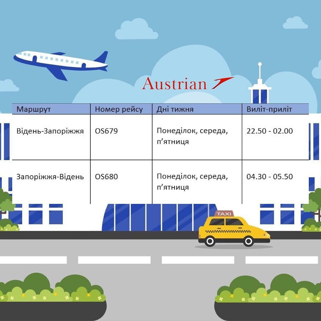 Маршрут Відень – Запоріжжя пропонується вперше та виконуватиметься тричі на тиждень літаками типу Embraer 195.