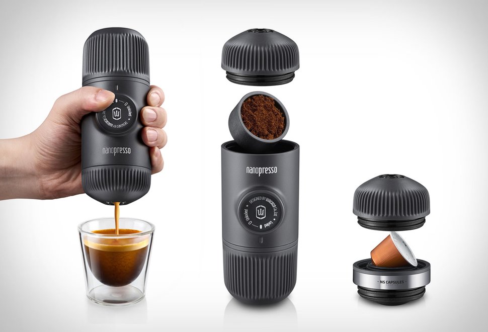 Портативна кавомашина готує каву із мелених зерен. Працює вона від батарейок, але доведеться докласти і трохи власних зусиль. Натиснувши на спеціальний поршень - 10-15 разів - отримаєте філіжанку запашної походної кави.