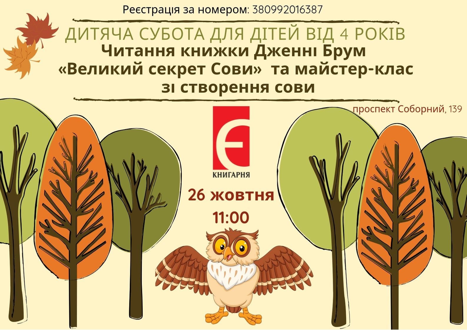 26 жовтня, 11.00 - Дитяча субота у Книгарні "Є". Читання книжки та майстер-клас зі створення сови. Пр.Соборний, 139