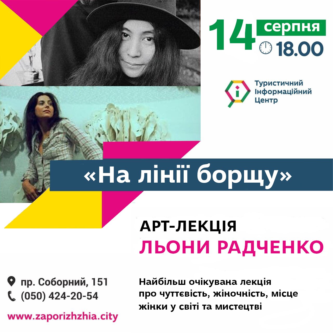 14 серпня о 18:00 в Zaporizhzhia.city Hub не пропустіть гостру та провокативну арт-лекцію від Льони Радченко "На лінії борщу". Жіноче мистецтво може бути чуттєвим, сміливим, глибоким, відкритим і зухвалим, саме про це поговоримо під час арт-зустрічі.
