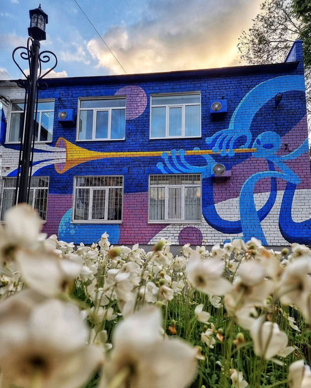 Famous Zaporizhzhya artist, designer, sculptor Roman Khalilov worked on the creation of the mural. According to the plan, the facade of the building is decorated with an image of an alien playing a musical instrument.