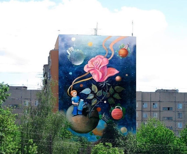 Принц, який поливає улюблену Троянду, за сюжетом однойменної книги французького письменника Антуана де Сента-Екзюпері.  Його оточує велика кількість планет, але та, що поблизу, – розфарбована у кольори українського Прапору. Створила мурал вінницька художниця Ольга Гаєвик.