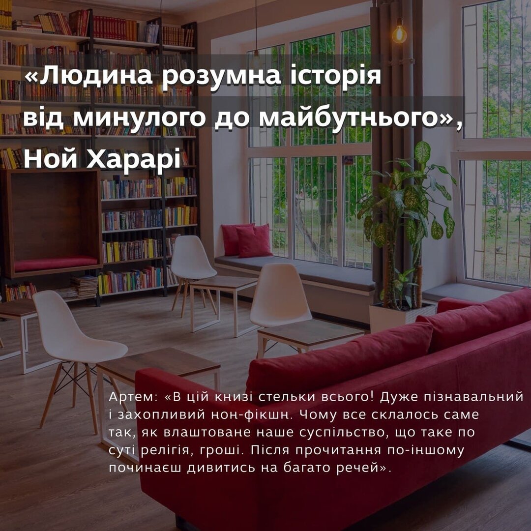 Артем: «В цій книзі стільки всього! Дуже пізнавальний і захопливий нон-фікшн про історію та розвиток людства. Чому все склалось саме так, як влаштоване наше суспільство, що таке по суті релігія, гроші. Дуже багато інформації. Іноді здається, що мозк закипає, але після прочитання по-іншому починаєш дивитись на багато речей».