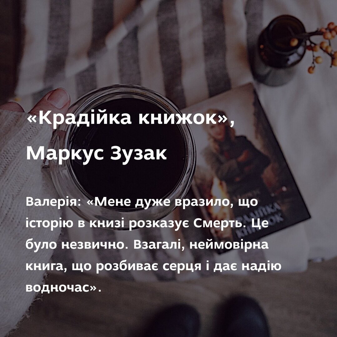 Валерія: «Мене дуже вразило, що історію в книзі розказує Смерть. Це було незвично. Взагалі, неймовірна книга. В ній багато суму і жахів війни. Дуже емоційна, вона нікого не залишає байдужим. Читати було місцями складно. Книга, що розбиває серця і дає надію водночас».