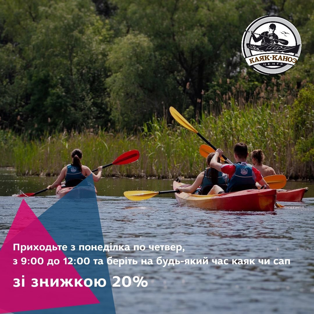 Приходьте з понеділка по четвер, з 9:00 до 12:00 та беріть на будь-який час каяк чи сап зі знижкою 20%