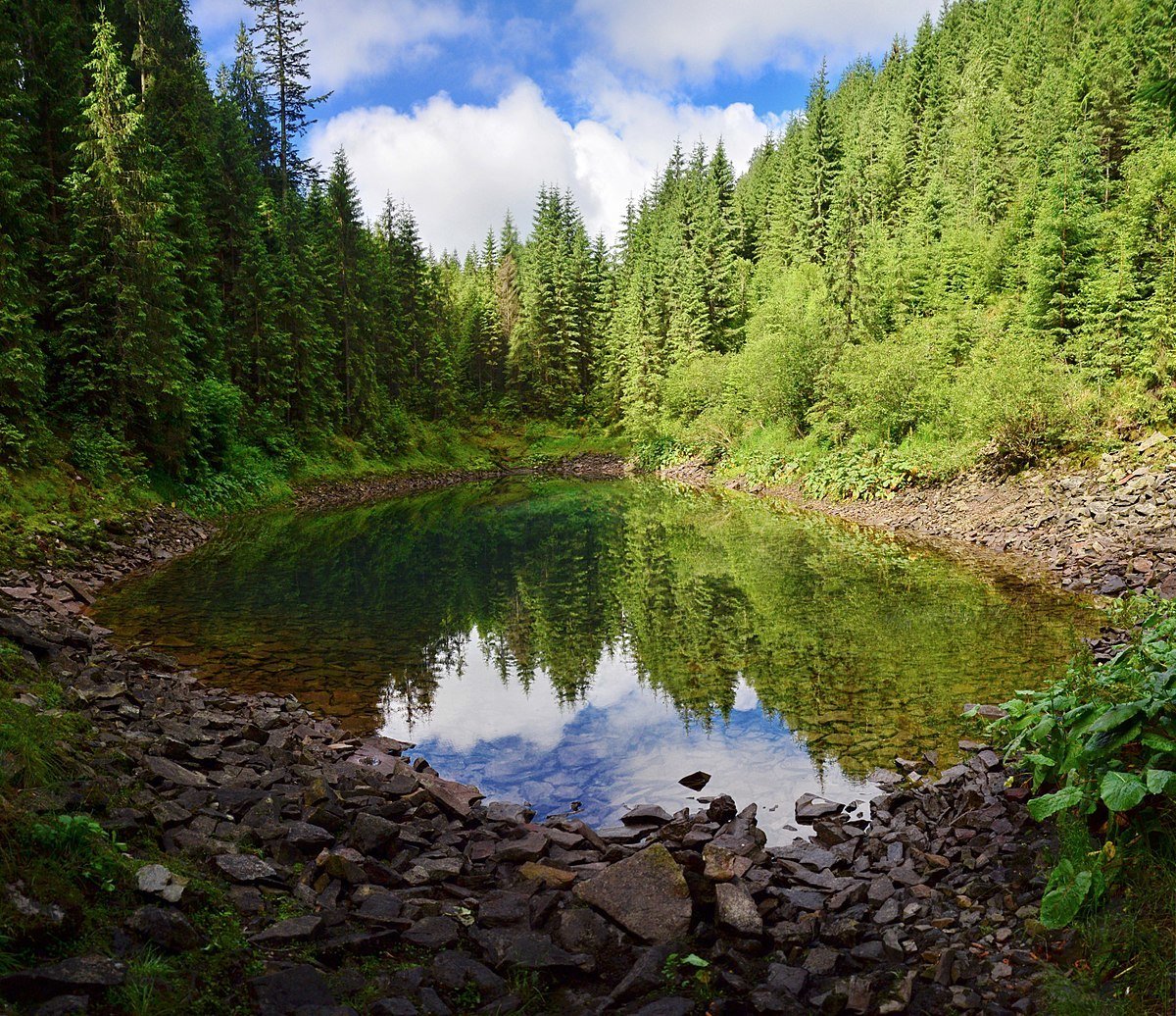 Озеро у самому серці густого смерекового лісу. Вода у ньому настільки чиста, що якщо підійти близько до берега можна побачити дно.