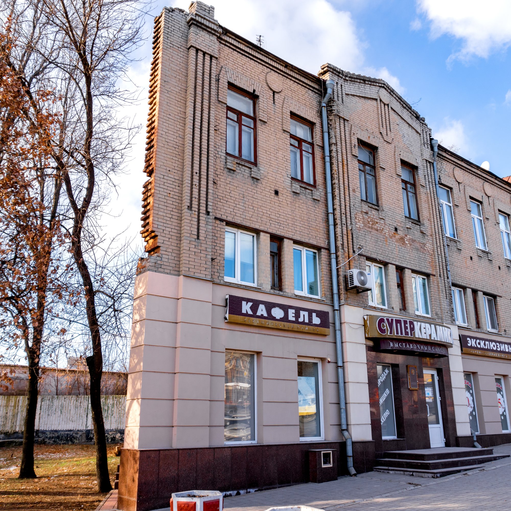 На перший погляд нічого незвичного в будинку немає. Але якщо подивитись на нього збоку, з певного ракурсу, то виявиться, що він виглядає плоским. Цього року йому виповнюється 111 років. В часи Олександрівська тут був прибутковий будинок П. Когана, який у 1911 році отримав дозвіл на відкриття в ньому «Великого московського готелю». Будівля в стилі модерн збереглася не повністю. Раніше кутову частину прикрашала невелика вежа, а на другому поверсі були ковані балкони.