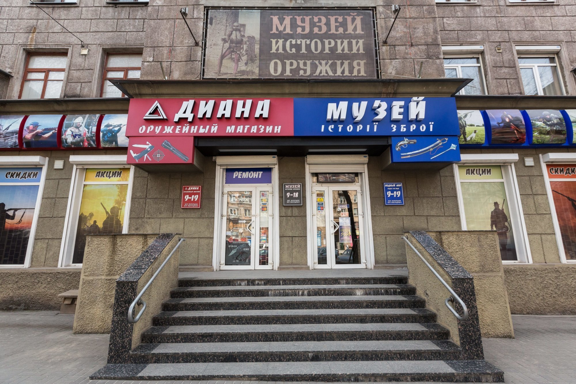 Основою експозиції музею є приватна колекція директора магазину зброї «Діана» Віталія Шлайфера. Основною темою колекції, що стала початком музею, є історія виникнення та розвитку зброї.