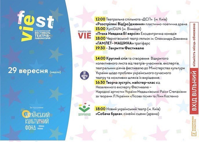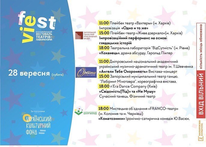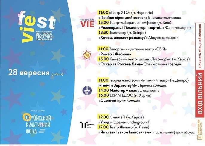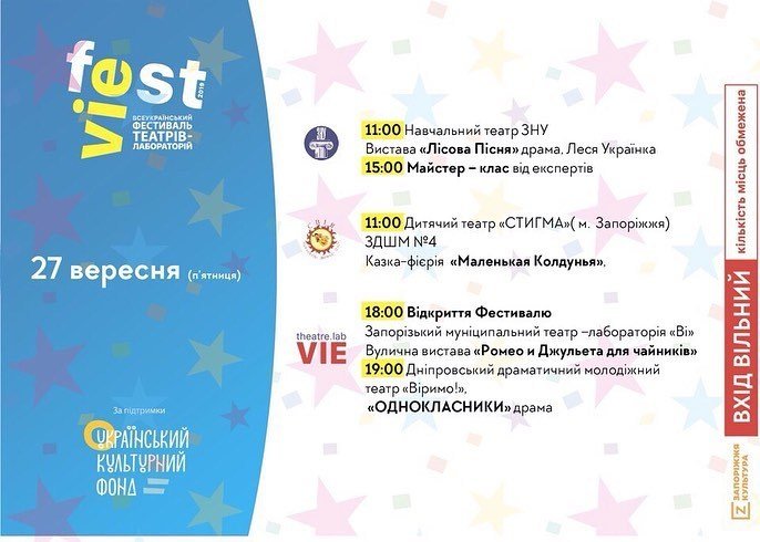 Всеукраїнський фестиваль театрів – лабораторій «VIEfest» відбуватиметься у Запоріжжі 27, 28 та 29 вересня. Фестивальна програма передбачає показ театральних вистав без обмежень театрального жанру на сценах професійних театрів та театральних майданчиках міста. Зберігайте програму фестивалю аби вчасно обрати локацію і не пропустити найцікавіші перфоманси. Вхід на фестиваль вільний.