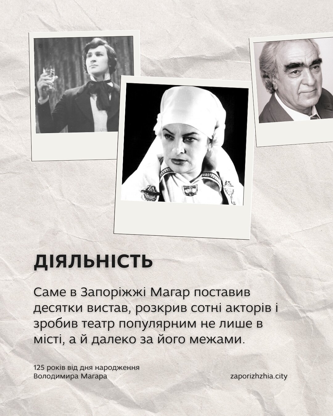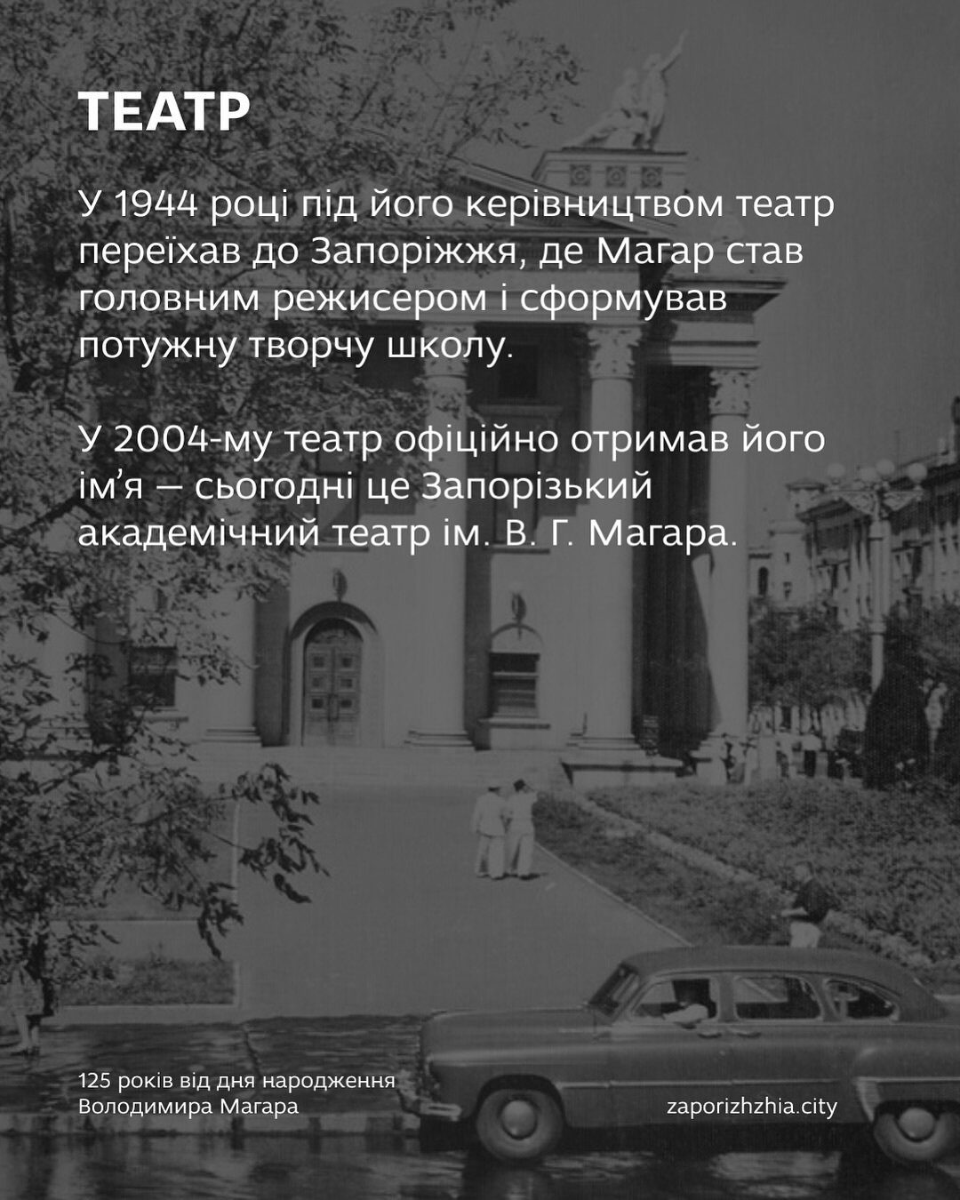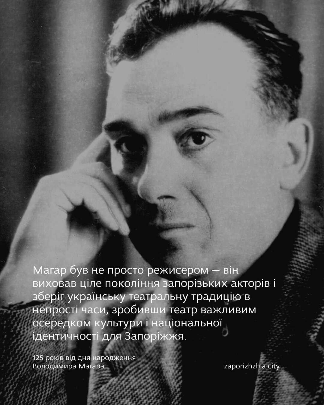Саме завдяки йому у 1944 році театр оселився в місті, а в 1953-му відкрив сцену, яка стала символом післявоєнного відродження. Магар поставив десятки знакових вистав і виховав покоління акторів, що прославили Запоріжжя далеко за його межами.