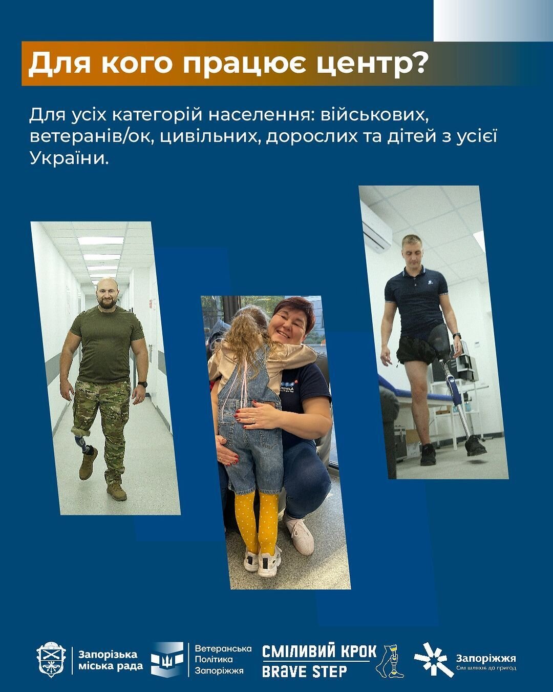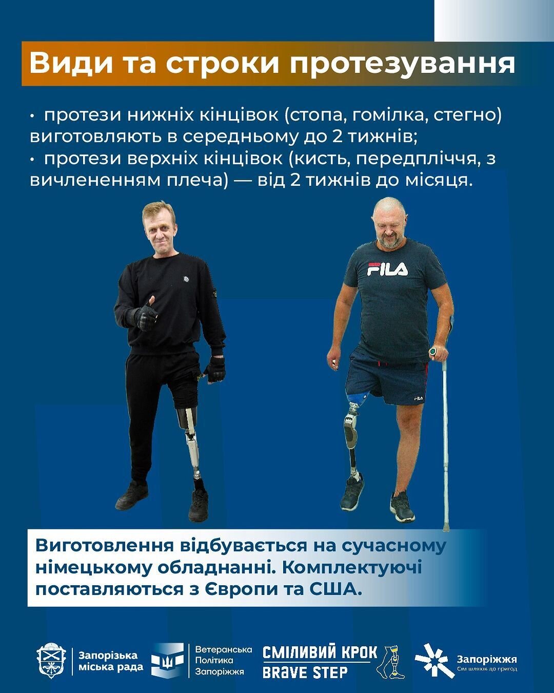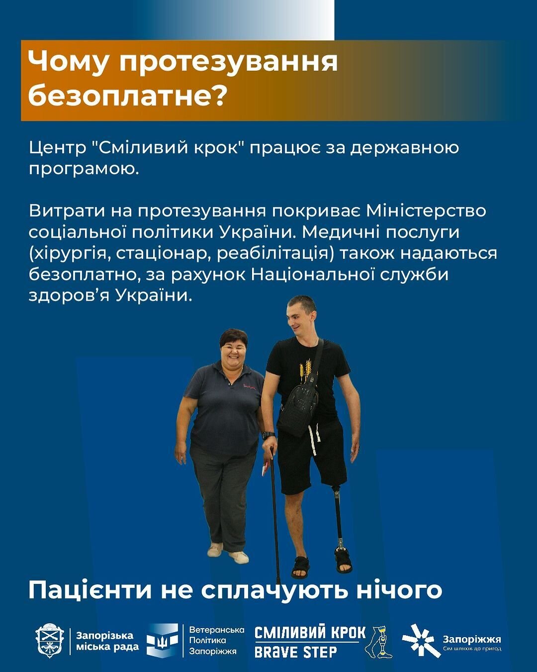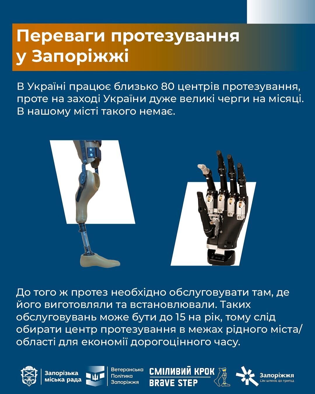 Відновити фізичну самостійність можна, звернувшись до протезного центру «Сміливий крок» у Запоріжжі. У ньому працюють фахівці з багаторічним досвідом протезування, проходженням стажування в США (Мінесота) та в Словаччині (Братислава) з отриманням сертифікації.