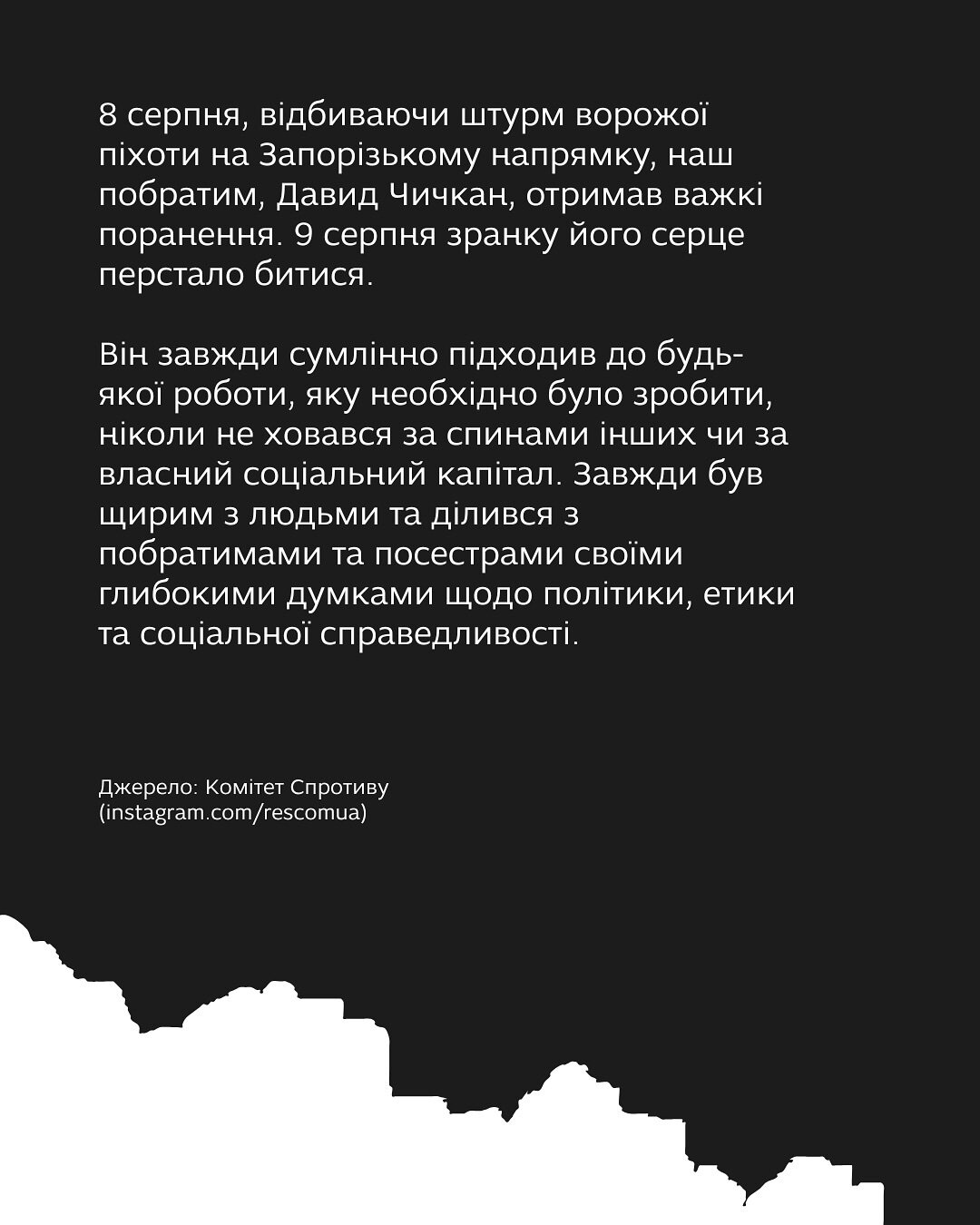 8 серпня, відбиваючи штурм на Запорізькому напрямку, Давид Чичкан отримав тяжкі поранення, а 9 серпня його серце зупинилося.