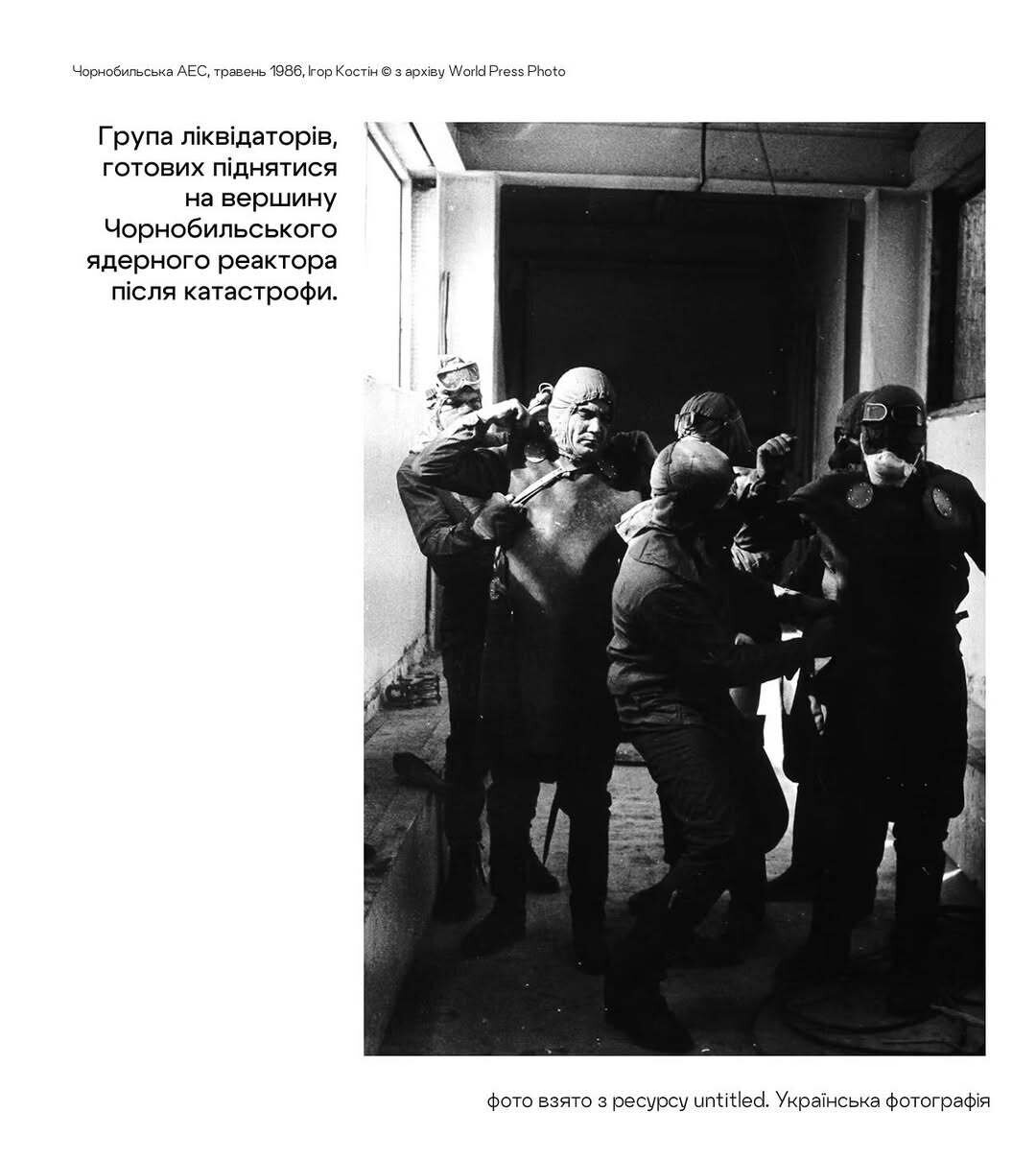 «Чорнобиль» українського фоторепортера Ігоря Костіна - це про момент, трагедію та взаємодопомогу. За цей фотоматеріал, зроблений фотографом в небезпечних умовах високого рівня радіації, Ігор Костін отримав в 1987 році першу премію на міжнародному фотоконкурсі World Press Photo (Нідерланди).