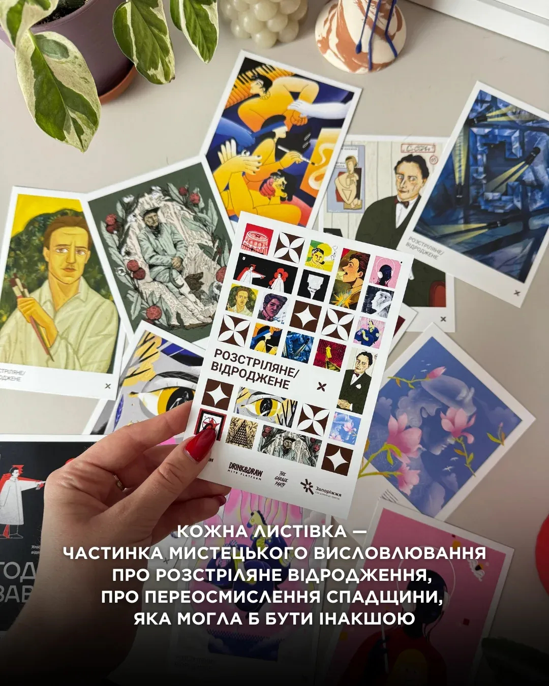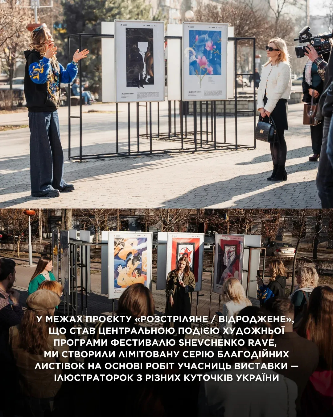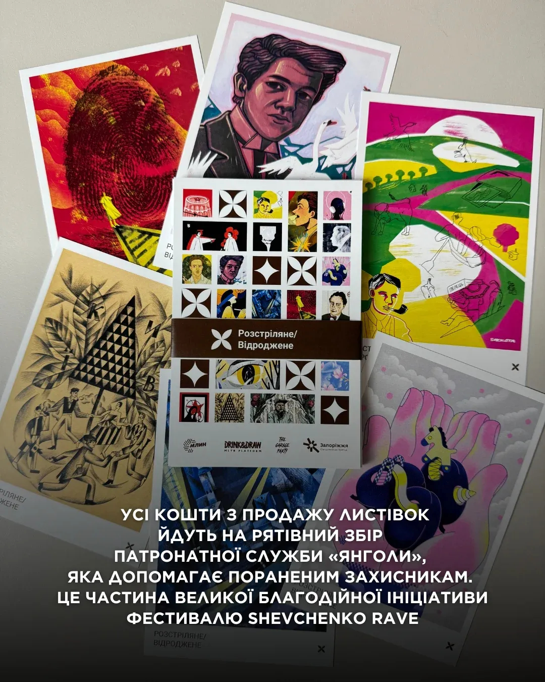 У межах проєкту «Розстріляне / Відроджене», що став центральною подією художньої програми фестивалю Shevchenko Rave, ми створили лімітовану серію благодійних листівок на основі робіт учасниць виставки — ілюстраторок з різних куточків України.