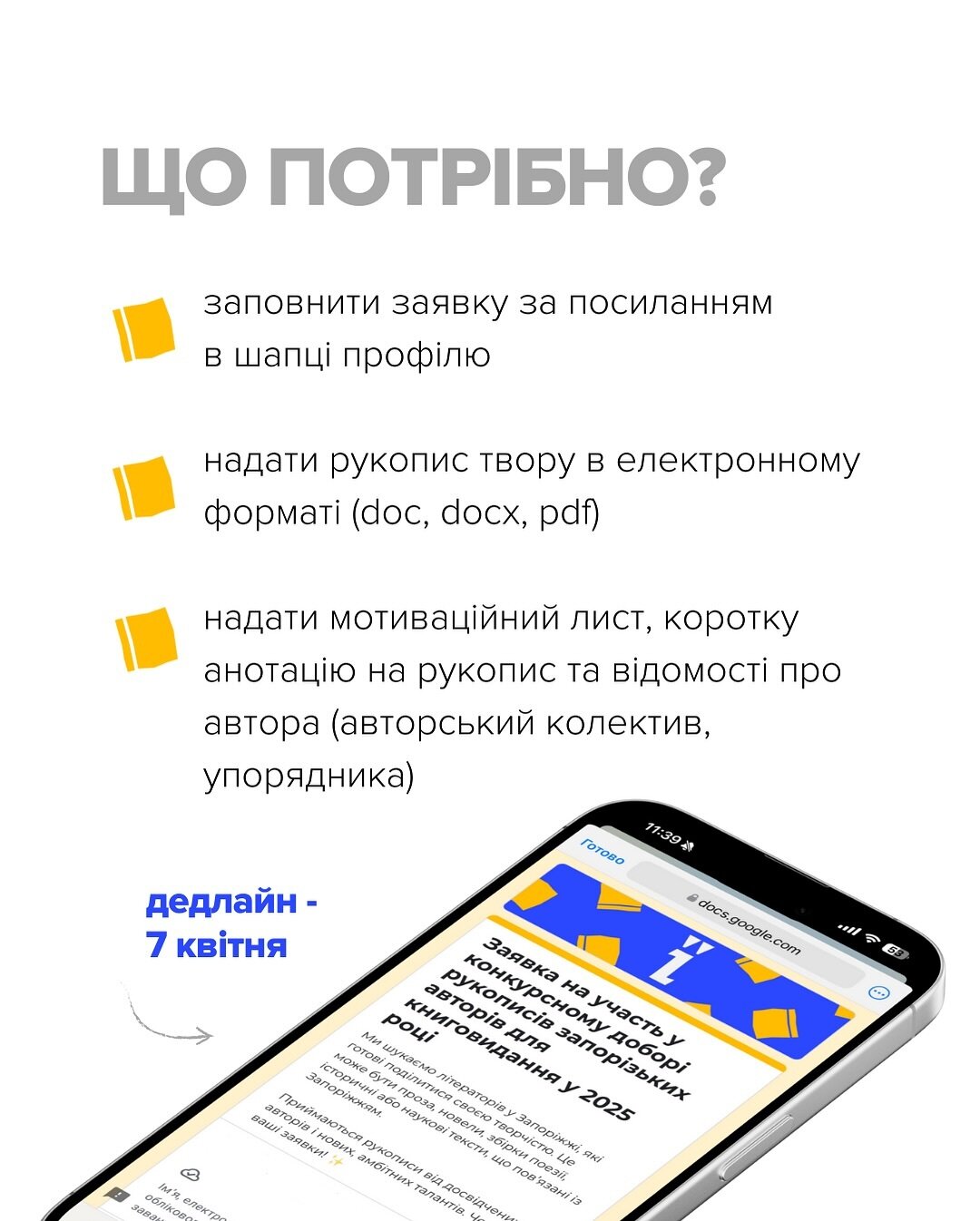 Департамент культури і туризму за підтримки @zaporizhzhia_city_council шукає літераторів у Запоріжжі, які готові поділитися своєю творчістю. Це може бути проза, новели, збірки поезії, історичні або наукові тексти, що пов’язані із Запоріжжям.