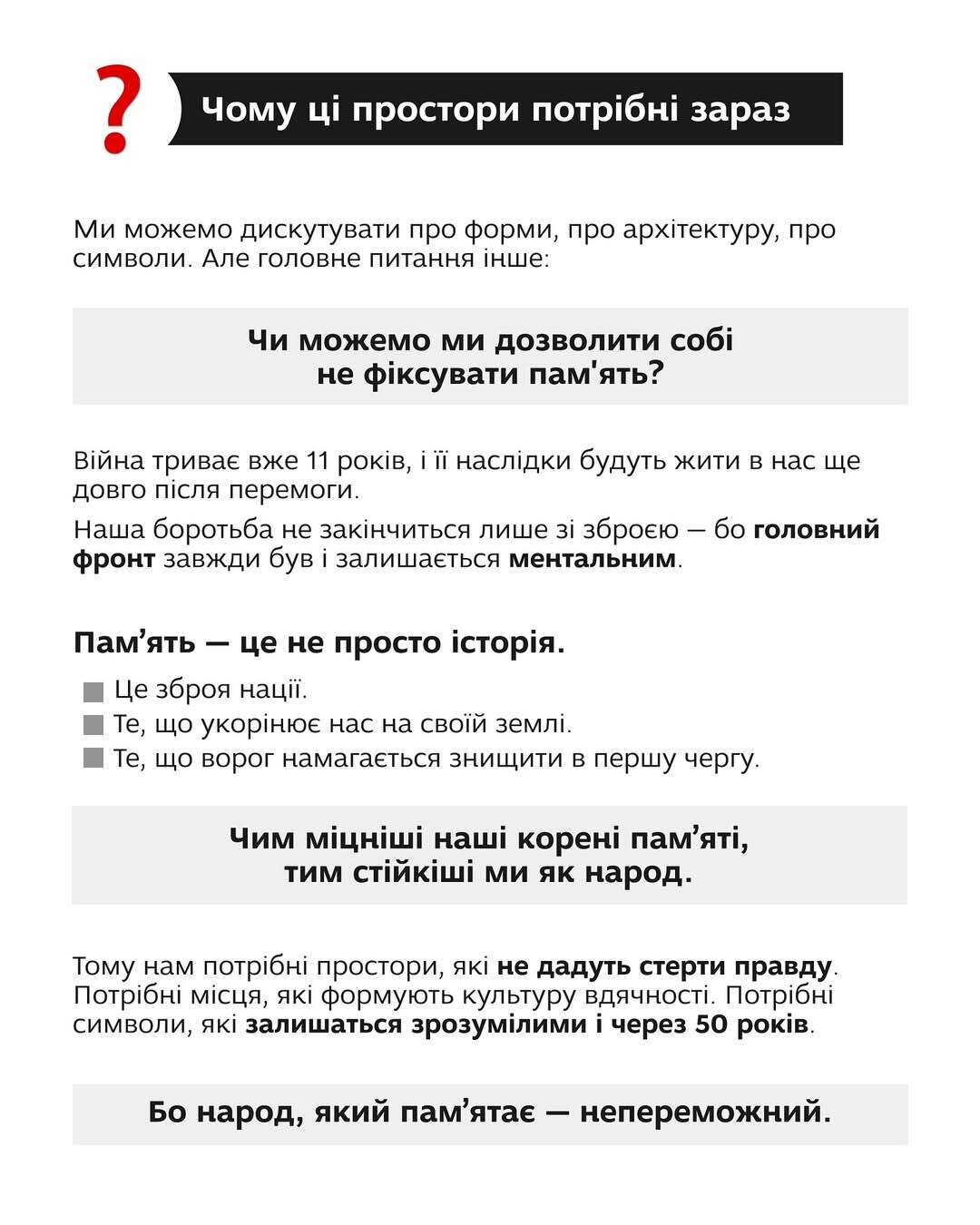 І якщо ми говоримо про нову культуру меморіалізації в Україні, то вона повинна починатися не з монументів, а з людини. З того, як ми передаємо пам’ять наступним поколінням і як працюємо з нею в суспільстві, яке живе у стані війни.