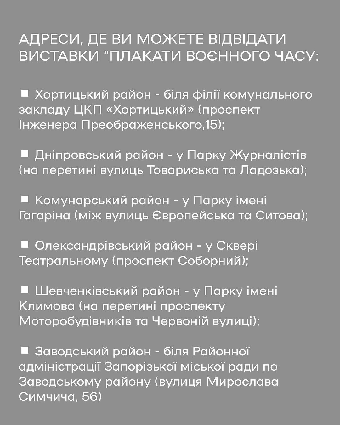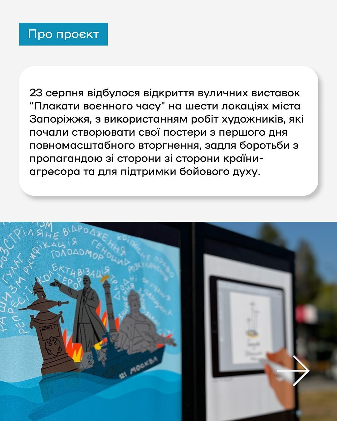 Виставка @ukrainianwartimeposters сприяє культурно-мистецькому життю міста та має важливу місію - протистояти інформаційному впливу рф та протидіяти російській відкритій та прихованій пропаганді. А також підтримувати патріотичний та моральний дух запоріжців та гостей міста!